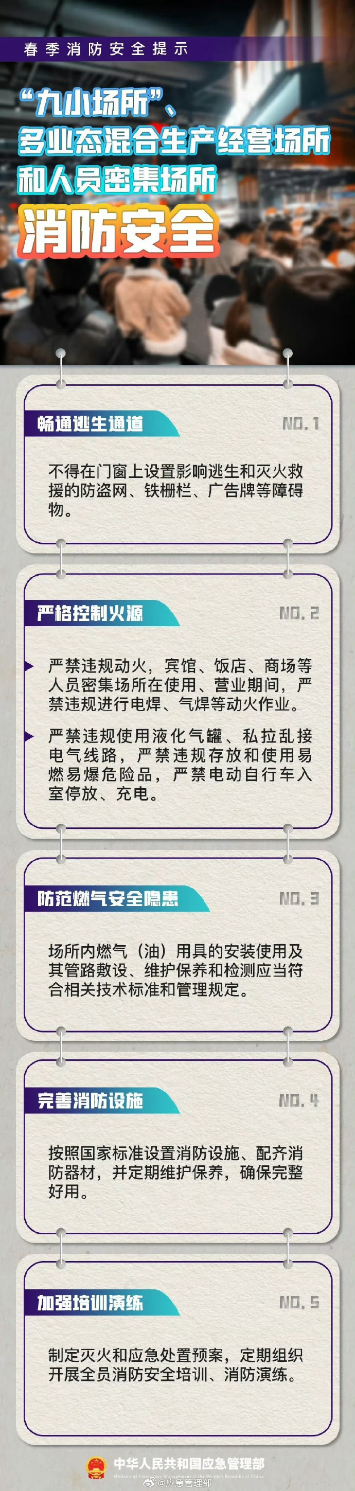 春季天干物燥,大風(fēng)天氣多,一個(gè)小火星就可能引起火災(zāi)。因此,在生活生產(chǎn)中,一定要注意防范安全隱患。 “九小場(chǎng)所”、多業(yè)態(tài)混合生產(chǎn)經(jīng)營場(chǎng)所、人員密集場(chǎng)所等要注意哪些事項(xiàng)?