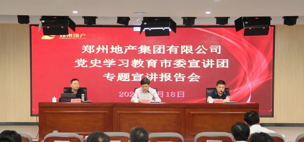 為持續(xù)推進(jìn)黨史學(xué)習(xí)教育走深走實(shí),5月18日上午,鄭州市委宣講團(tuán)走進(jìn)鄭州地產(chǎn)集團(tuán),在集團(tuán)301多功能廳開展黨史學(xué)習(xí)教育專題宣講報(bào)告會(huì)。報(bào)告會(huì)由鄭州市委宣講團(tuán)成員、鄭州工程技術(shù)學(xué)院馬克思主義學(xué)院副教授張豪主講,市國資黨史學(xué)習(xí)教育第二巡回指導(dǎo)組組長、四級(jí)調(diào)研員段德強(qiáng),指導(dǎo)組成員張?jiān)娪?、陳祥斐到?huì)巡聽旁聽,地產(chǎn)集團(tuán)領(lǐng)導(dǎo)班子、總部全體員工,各子公司支部書記、黨建部門負(fù)責(zé)人等共計(jì)150余人參加現(xiàn)場報(bào)告會(huì),各子公司員工共計(jì)170余人通過線上直播進(jìn)行觀看,會(huì)議由地產(chǎn)集團(tuán)黨委書記、董事長萬永生主持。