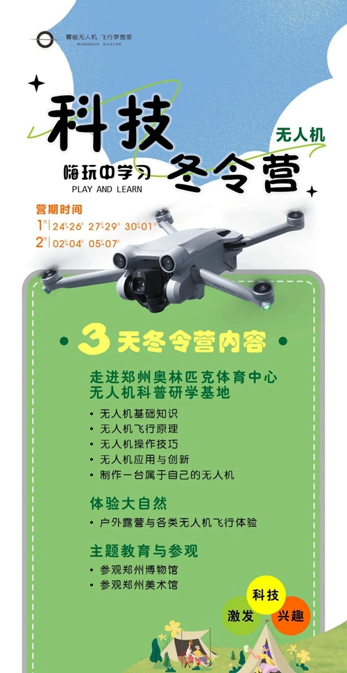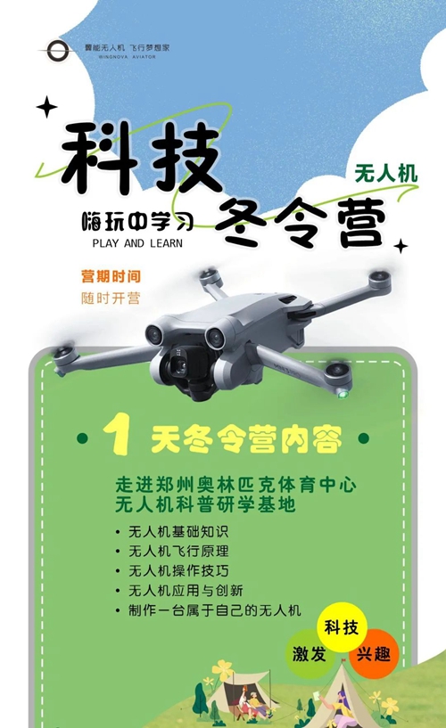 鄭州奧體翼能無人機研學基地是集無人機科普、研學、開發(fā)、應用、賽事運營的綜合服務(wù)平臺,不僅擁有1000余平方米的無人機科普教育基地,還擁有無人機駕駛執(zhí)照的培訓資格。寒假期間,依托鄭州奧體中心開闊場館,翼能無人機將科普知識與實操表演完美結(jié)合,分別開設(shè)1至5天不等的科技冬令營,代領(lǐng)孩子們放飛科技夢,在嗨玩中學習。