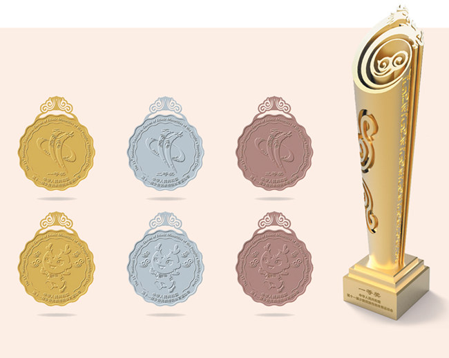獎杯《龍鳳書卷》,靈動而不失莊重。獎杯上端外觀基于會徽核心圖形“龍鳳”,具有較高的辨識度。龍鳳組成“11”圖案,呈相依相伴騰飛之勢,中間升騰古老的祥云圖案,彰顯中華文明生生不息的活力。獎杯底座由三級臺階組成,寓意“三個(gè)離不開”(漢族離不開各少數(shù)民族,各少數(shù)民族離不開漢族,各少數(shù)民族之間也互相離不開)思想和步步高的美好祝福,激勵運(yùn)動員奮力拼搏。