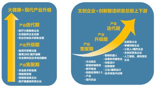 產(chǎn)業(yè)方面:以“大健康”+“文創(chuàng)娛樂”+“創(chuàng)新智造”為主導(dǎo)產(chǎn)業(yè),科技服務(wù)和創(chuàng)意研發(fā)為輔助產(chǎn)業(yè)。