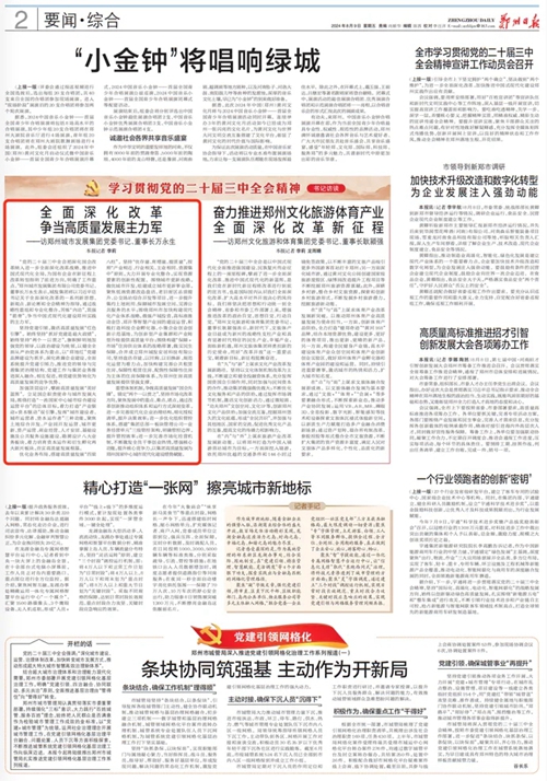 “黨的二十屆三中全會把深化國企改革納入進一步全面深化改革戰(zhàn)略、推進中國式現(xiàn)代化全局,為國有企業(yè)在新征程上改革轉(zhuǎn)型指明了前進方向,明確了工作重點。”鄭州城市發(fā)展集團有限公司黨委書記、董事長萬永生表示,城發(fā)集團將以習(xí)近平總書記關(guān)于全面深化改革的一系列新思想、新觀點、新論斷和全會精神為指導(dǎo),通過戰(zhàn)略性重組和專業(yè)化整合,苦練“內(nèi)功”,筑強“筋骨”,爭當(dāng)中國式現(xiàn)代化建設(shè)鄭州實踐的主力軍。