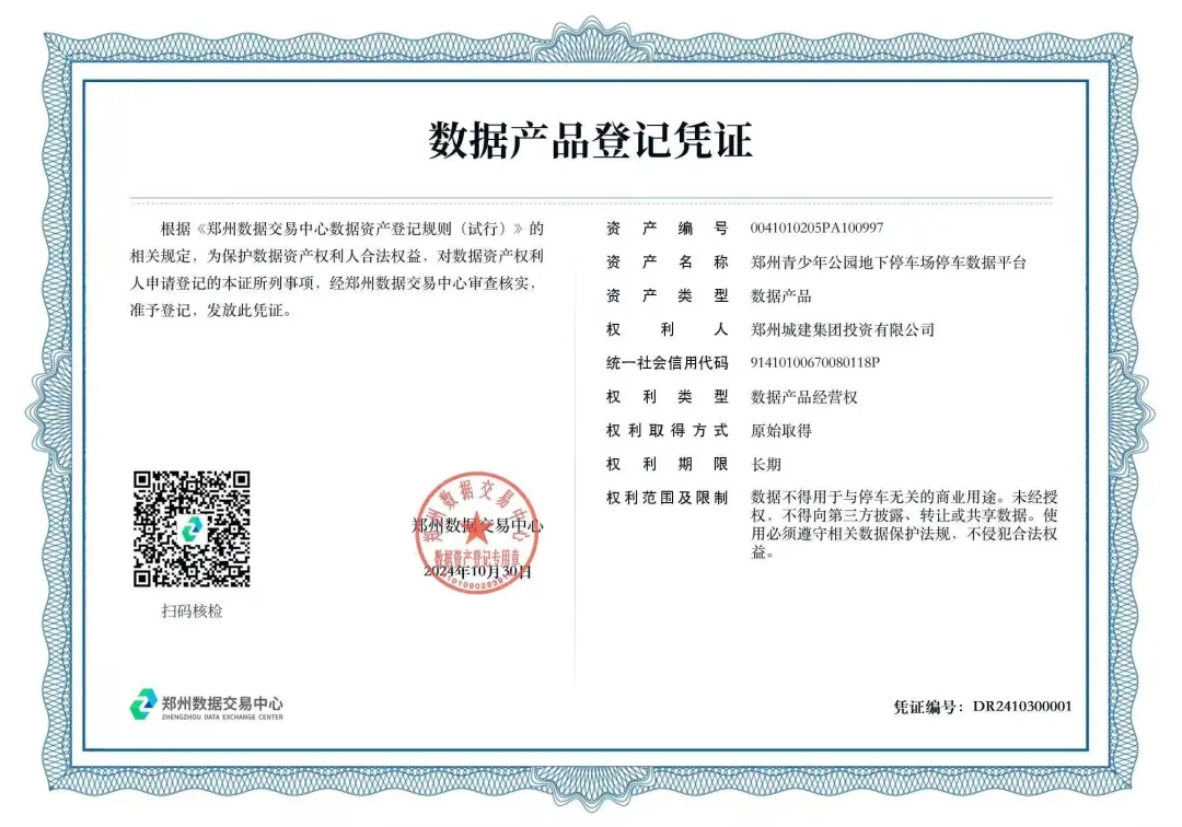 10月30日,城發(fā)集團(tuán)下屬子公司鄭州城建集團(tuán)投資有限公司(以下簡(jiǎn)稱“城建集團(tuán)”)在鄭州數(shù)據(jù)交易中心成功完成了“鄭州青少年公園地下停車場(chǎng)停車數(shù)據(jù)平臺(tái)”數(shù)據(jù)產(chǎn)品的資產(chǎn)登記,喜獲數(shù)據(jù)產(chǎn)品登記憑證,成為鄭州市首家將停車數(shù)據(jù)資產(chǎn)入表的國(guó)有企業(yè)。