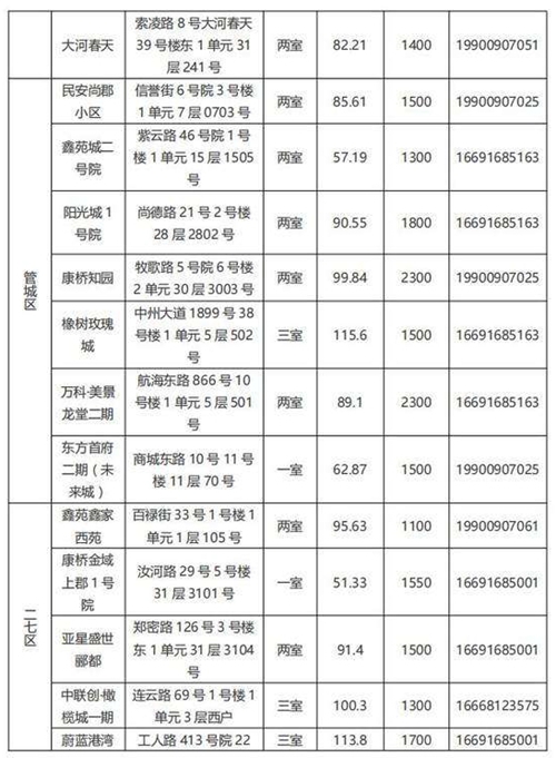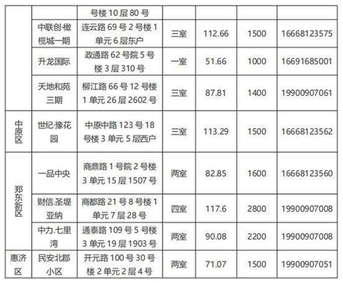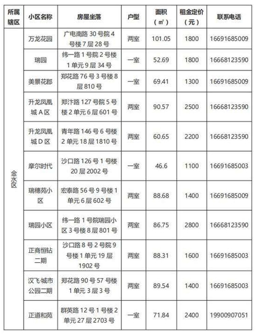 本批次配租房源共計32套,其中金水區(qū)12套、管城區(qū)7套、二七區(qū)8套、中原區(qū)1套、鄭東新區(qū)3套、惠濟(jì)區(qū)1套。水電費均為民用水電標(biāo)準(zhǔn),物業(yè)費為各小區(qū)物業(yè)收費標(biāo)準(zhǔn),房源精裝修交付,周邊配套設(shè)施齊全,配備家具家電,拎包入住,后續(xù)房源將根據(jù)裝修進(jìn)度情況陸續(xù)配租。