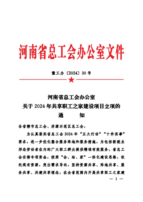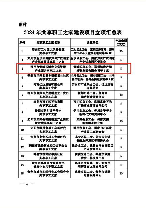 近日,河南省總工會發(fā)布《關于2024年共享職工之家建設項目立項的通知》,決定對城發(fā)金岱智慧產(chǎn)業(yè)園共享職工之家等32個共享職工之家建設項目進行立項,并對城發(fā)金岱智慧產(chǎn)業(yè)園共享職工之家給予資金補助,鄭州市僅有三家職工之家獲得立項,這是城發(fā)金岱智慧產(chǎn)業(yè)園共享職工之家建設運營后取得的第一份殊榮。