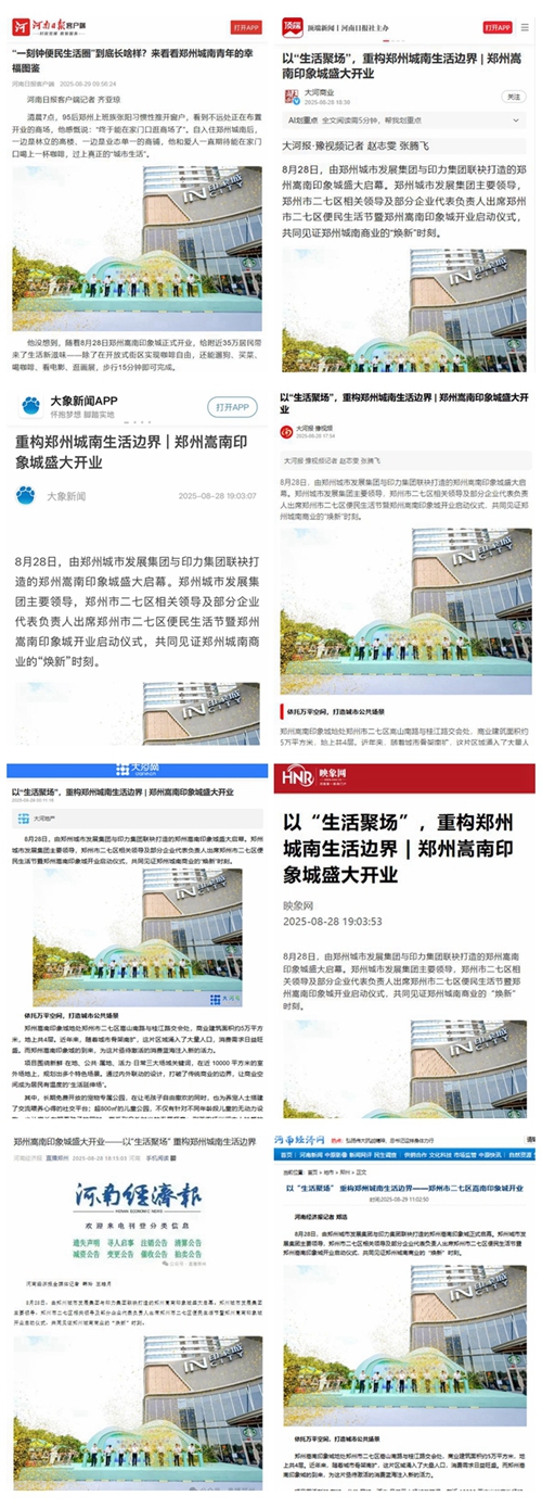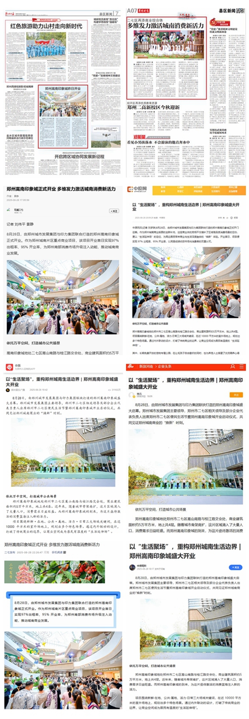 8月28日,鄭州城南商業(yè)格局迎來重大變革,由鄭州城市發(fā)展集團(tuán)與印力集團(tuán)攜手打造的鄭州嵩南印象城盛大啟幕,開業(yè)首日客流達(dá)12.6萬人次,迅速成為全城矚目的焦點(diǎn)。這一盛事引發(fā)了各大媒體的廣泛關(guān)注,河南日報客戶端、頂端新聞、大象新聞、大河報、大河網(wǎng)、映象網(wǎng)、河南經(jīng)濟(jì)報、鄭州日報、鄭州晚報、鄭州廣播電視臺等媒體紛紛聚焦,對其開業(yè)進(jìn)行了全方位、多角度的報道。