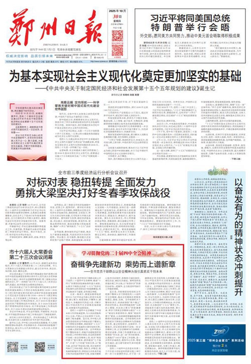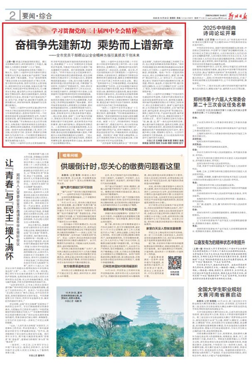 黨的二十屆四中全會(huì)擘畫了中國(guó)式現(xiàn)代化建設(shè)的宏偉藍(lán)圖,為新時(shí)代新征程國(guó)有企業(yè)改革發(fā)展指明前進(jìn)方向、提供根本遵循,鄭州城發(fā)集團(tuán)廣大黨員干部群眾深受鼓舞、倍感振奮。近日,《鄭州日?qǐng)?bào)》《鄭州晚報(bào)》開設(shè)了【學(xué)習(xí)貫徹黨的二十屆四中全會(huì)精神】專欄,2025年10月30日,報(bào)道了鄭州城發(fā)集團(tuán)深入學(xué)習(xí)貫徹落實(shí)黨的二十屆四中全會(huì)精神,以全會(huì)精神為指引真抓實(shí)干創(chuàng)未來。