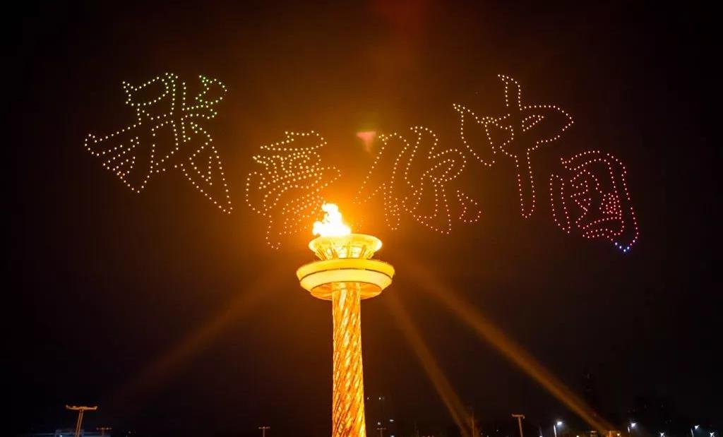 當(dāng)現(xiàn)場屏幕通過虛擬技術(shù)應(yīng)用,呈現(xiàn)出美麗的畫面,讓現(xiàn)場觀眾仿佛置身北國北川、南嶺飛瀑之中,觀眾都情不自禁地揮舞起了手中的國旗為他們的表演喝彩!為我們偉大的祖國喝彩!1000架無人機從奧體中心廣場升起迅速變換成中中的造型,點燃民族運動會的火炬。