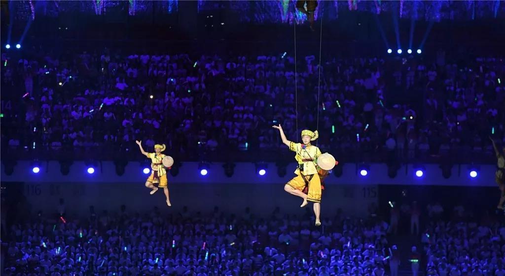 5塊總面積,超過3000平米的輕型透明網(wǎng)幕,130余臺高清投影機覆蓋上萬平米場地,通過威亞的技術(shù)手段和地面投影相呼應(yīng)。地面、空中、立面多維度的表演空間,將各種特色民族元素呈現(xiàn)出來,呈現(xiàn)了各族人民的幸福生活,書寫出一張張民族文化名片。當(dāng)現(xiàn)場各族人民跳起歡快的舞蹈,當(dāng)各民族美麗的服飾在現(xiàn)場轉(zhuǎn)出最絢麗的弧度,展現(xiàn)出各民族團結(jié)奮進、朝氣蓬勃的精神風(fēng)貌。作為河南特色的少林和太極兩個重要元素也在本次開幕式精彩亮相,由塔溝武校數(shù)千名演員演繹。隨著音樂節(jié)奏的轉(zhuǎn)換,他們變幻各種造型,動靜結(jié)合、氣勢恢宏,讓觀眾更加了解精彩河南。