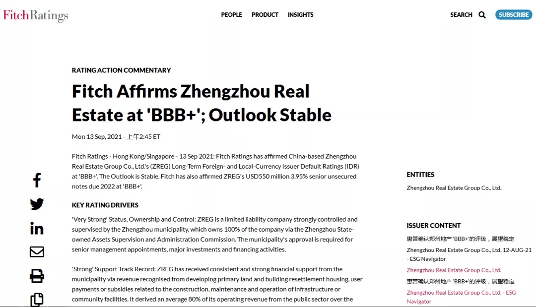 2021年9月13日,惠譽國際評級確認鄭州地產(chǎn)集團有限公司(簡稱:鄭州地產(chǎn))發(fā)行人評級為“BBB+”,展望穩(wěn)定。