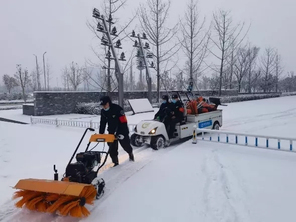 1月21日暴雪如期而至,鄭州奧體中心立刻根據(jù)雪情安排作業(yè)路段及區(qū)域,投入人員百余人、輔助工具近200個,各類除雪輔助車輛5輛,融雪劑2噸,第一時間清除機(jī)動車道、步道上的積雪,確保道路安全不結(jié)冰。對園區(qū)出入口、園區(qū)內(nèi)外環(huán)主要道路、建國飯店門廳、疫苗接種中心、辦公區(qū)域周邊做好除雪、防滑措施。