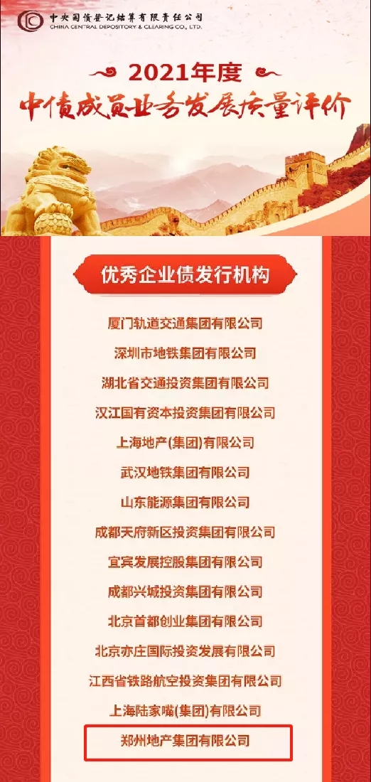 2022年1月4日,鄭州地產(chǎn)集團(tuán)獲評(píng)中央國(guó)債登記結(jié)算有限責(zé)任公司(以下簡(jiǎn)稱中央結(jié)算公司)發(fā)布的2021年度中債成員業(yè)務(wù)發(fā)展質(zhì)量評(píng)價(jià)“優(yōu)秀企業(yè)債發(fā)行機(jī)構(gòu)”。